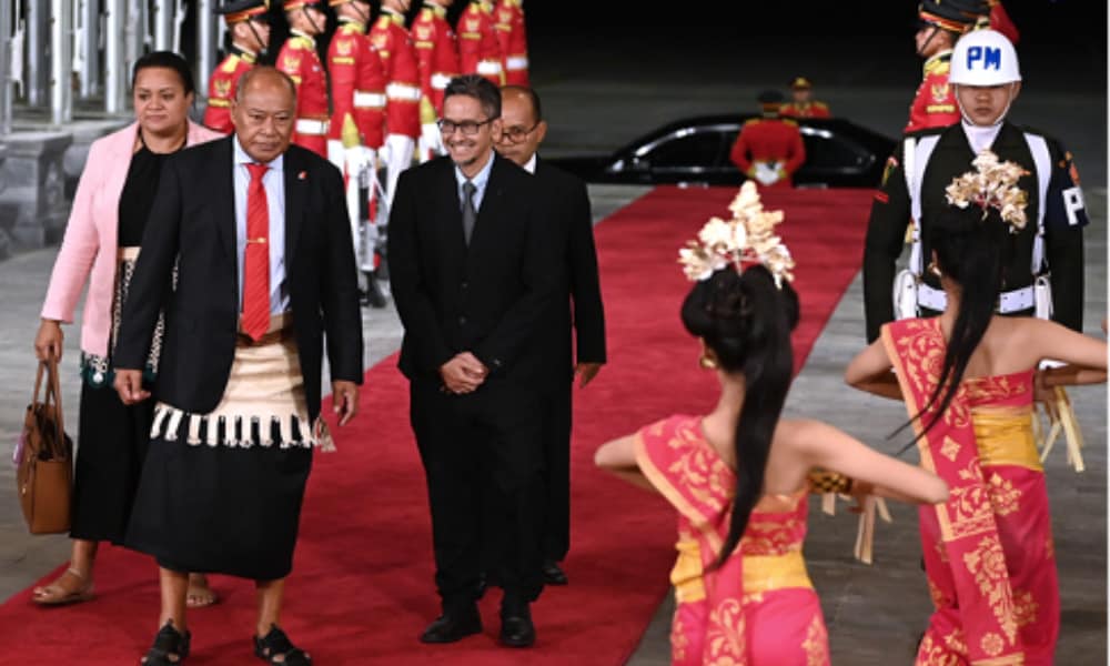 Deputy Prime Minister of Tonga, Samiu Kuita Vaipulu, (second left) and spouse Mele Muimui Liu Mei Tupou Latu Vaipulu (left) are greeted by the Assistant Deputy for Maritime Law and Treaties of the Indonesian Coordinating Ministry for Maritime Affairs and Investment, Radian Nurcahyo, (third left) upon arrival at I Gusti Ngurah Rai International Airport, Badung, Bali, on Sunday, 8 October 2023. Samiu Kuita Vaipulu arrived in Bali to attend the 2023 HLM of the AIS Forum in Nusa Dua, Bali on 10—11 October 2023. (Media Center of 2023 HLM of the AIS Forum /Fikri Yusuf/pras)