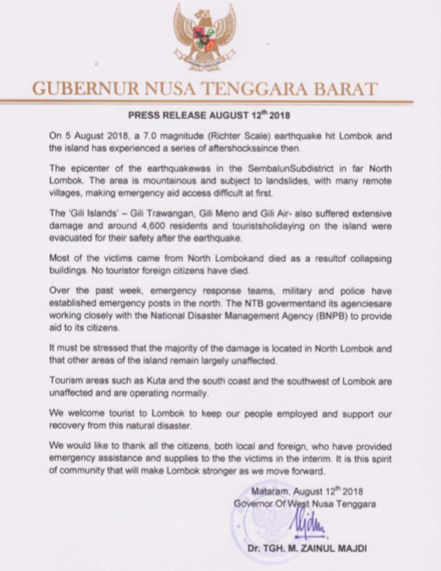 Press Release of The Governor of West Nusa Tenggara Province Regarding Lombok Earthquake, August 12th, 2018