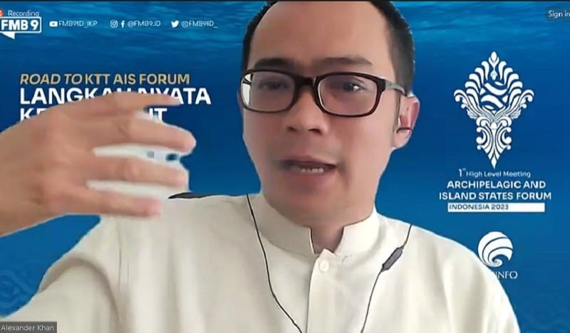 Padjadjaran University researcher who is also Indonesia's representative at the 2023 AIS RnD Conference, Alexander Muhammad Khan, speaks in the Forum Merdeka Barat (FMB9) Online Discussion: Road to the 2023 HLM of the AIS Forum entitled "Concrete Steps to Manage the Sea" in Jakarta, on Wednesday, 4 October 2023.